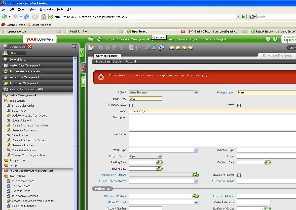 | Steps To Reproduce | # Go to Project & Service Management->Transactions->Service Project # Click New and fill: * Search Key: sca * Name: Service Project for Customer A * Create Temporary Price List: N (un-checked) # Move to Project Line tab. # Click New and fill: * Product: A Final goods * Planned Quantity: 10 * Tax: VAT 3% * Planned Price: 1.75 and verify Planned Amount is 17.5 * Planned Purchase Price: 1.2 # Go back to Service Project tab. # Select Service Project for Customer A and edit: * Business Partner: CUSTOMER A # Verify that: * Partner Address: "Pamplona, Street Customer center nº1" * The combo box User/Contact must have the value: Alfred * Price list: CUSTOMER A * Form of payment: Money Order * Payment terms: 30 days, 5 # Select: * Sales Representative: Eduard # Save and click on Change Project Status button and select Order. # Verify that: * Project Status is Order. * Price List is CUSTOMER A. # Move to Supplier tab. # Click New and fill: * Business partner: Vendor A # Verify that Price List is PURCHASE. # Save and click on Create Purchase Order from Project. # Move back to Service Project tab and navigate through Linked Items to the Purchase Order created. # Check that: * Business Partner: Vendor A * Price List: PURCHASE * Company Agent: Eduard * Form of Payment: Wire Transfer * Payment Terms: 90 days * Project: sca - Service Project for Customer A * Summed Line Amount: 12 * Grand Total Amount: 12.36 # Move to Lines tab. # Select A Final goods line and check that: * Ordered Quantity: 10 * UOM: Unit * Unit Price: 1.2 * List Price: 1.2 * Discount: 0 * Tax: VAT 3% * Line Net Amount: 12 # Go back to Header tab. # Click on Complete button. # Go back to Project & Service Management->Transactions->Service Project # Select Service Project for Customer A and click on Create Sales Order from Project button. # Navigate through Linked items to the Sales Order created. # Check that: * Business Partner: CUSTOMER A * Price List: CUSTOMER A * Invoice Terms: Customer schedule after delivery * Sales Representative: Eduard * Form of Payment: Money Order * Payment Terms: 30 days, 5 * Project: sca - Service Project for Customer A * Summed Line Amount: 17.5 * Grand Total Amount: 18.03 # Move to Lines tab. # Select A Final goods line and check that: * Ordered Quantity: 10 * UOM: Unit * Unit Price: 1.75 * List Price: 2 * Discount: 12.5 * Tax: VAT 3% * Line Net Amount: 17.5 # Go back to Header tab. # Click on Complete button. # Go back to Project & Service Management->Transactions->Service Project # Select Service Project for Customer A and click on Change Project Status button to close the project selecting Order closed option. Now create a new Service Project # Click New and fill: * Search Key: sca1 * Name: Service Project Save the record. Click "Copy Details" button. It throws an error message. Please refer the screenshot. | |||||||