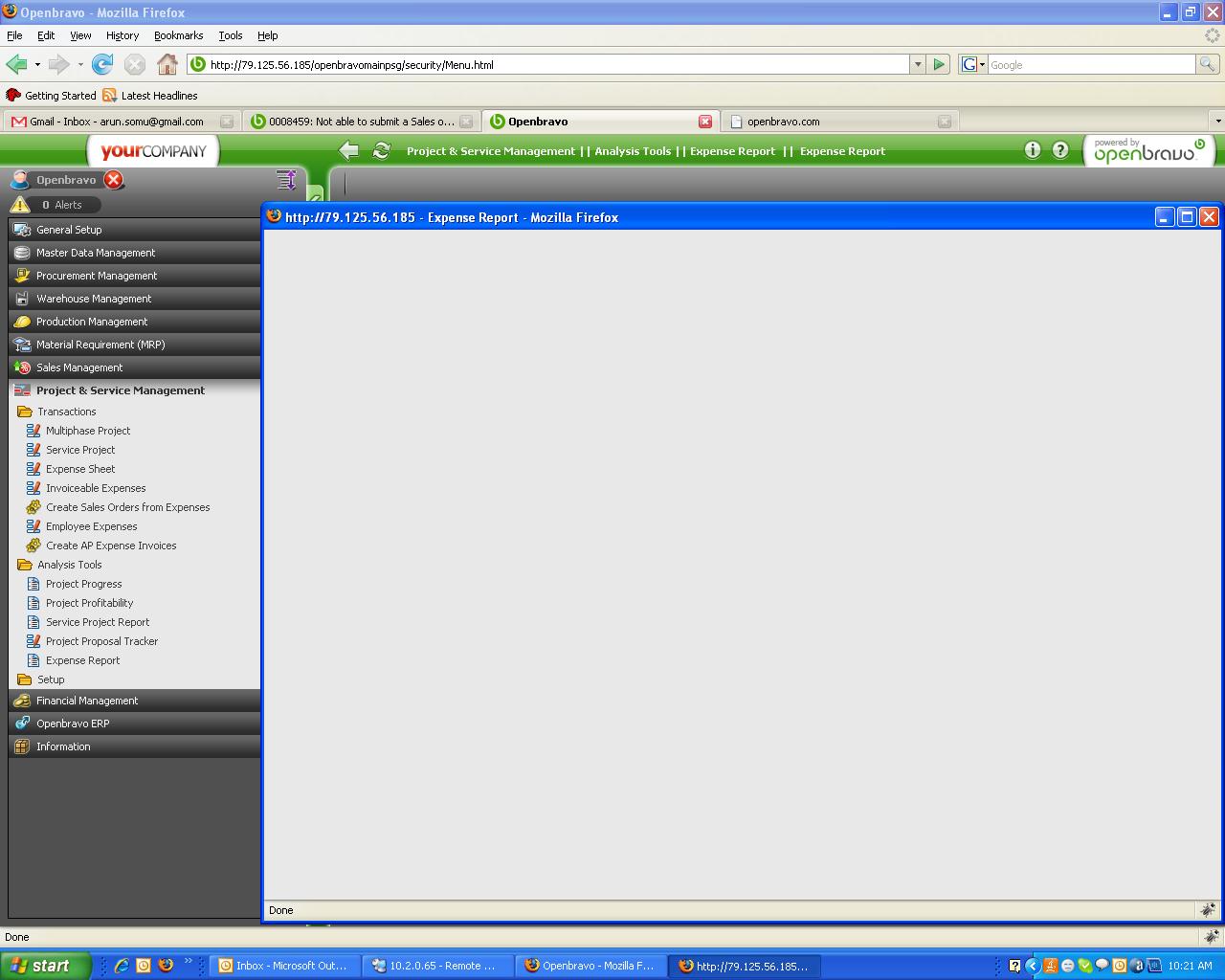 | Steps To Reproduce | Login as Openbravo/openbravo and change the role to Openbravo Admin. Go to Project & Service Management -> Analysis Tools -> Expense Report Select a business partner for whom there is no expense report is available. (For example : The Stones Foundries) Click HTML format. A page is displayed with no contents. | |||||||