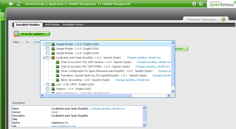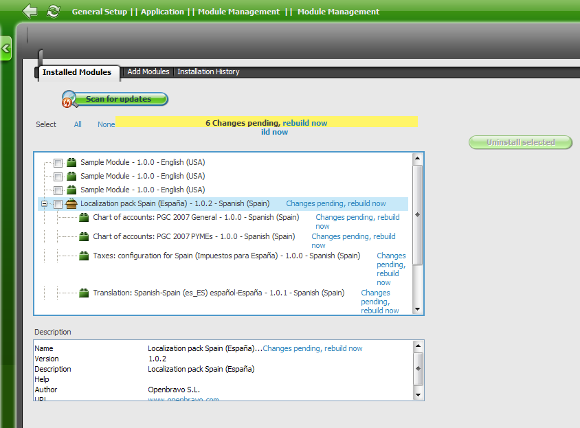 | Steps To Reproduce | 1. On a fresh Openbravo 2.50 main installation, login as Openbravo 2. Go General Setup > Application > Module Managent 3. Move to Add modules tab and add the Spanish Localization Pack, or other pack with more than one module. 4. Follow on screen instructions until you are returned to Installed Modules window 5. You should see the "Changes pending, rebuild now" link. 6. Expand the pack to see the contents, you should see a rebuild link for each line. Note that the layout gets ugly to this when viewing with Firefox 2 or Internet Explorer 7 | |||||||