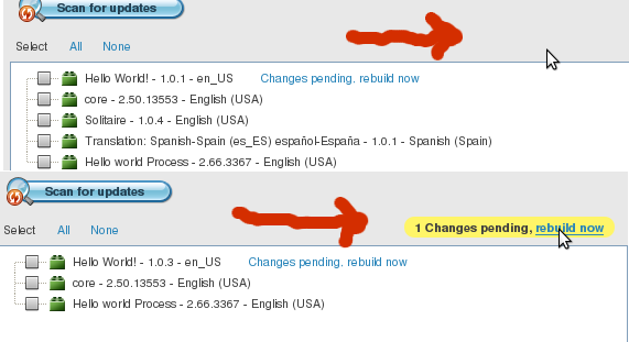 | Description | After installing a module, 3 rebuild links must appear in General Setup || Application || Module Management || Module Management > Installed modules: 1 in yellow in the top of both boxes. 1 next to the name in the first box. 1 next to the name in the second box. The one in yellow is not being shown after installing a module from central repository or from file system. (see attached image; the second image shows that it works installing an update). | |||||||