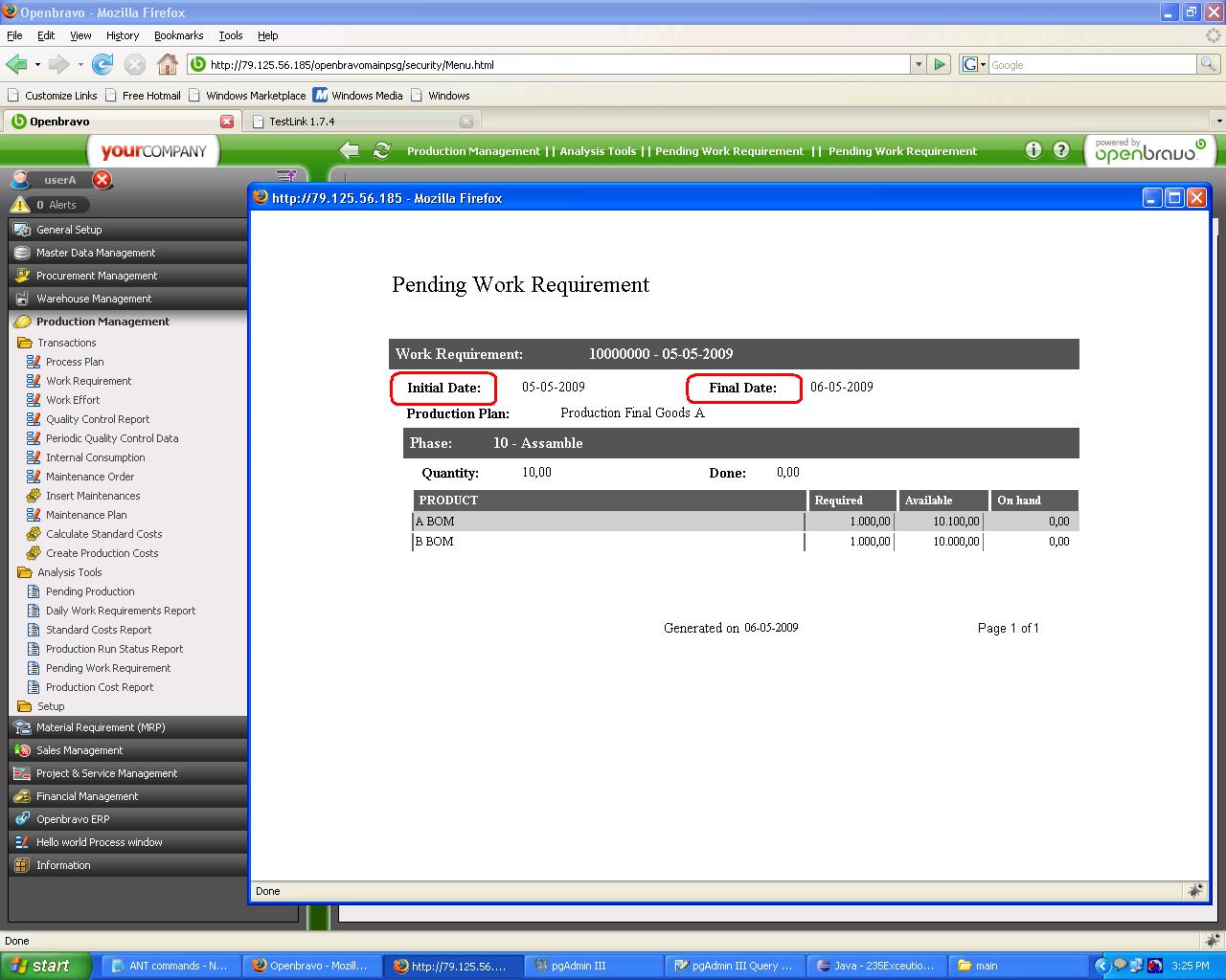 | Steps To Reproduce | # Login as userA # Go to Production management->Analysis Tools -> Pending Work Requirement. # Do not give inputs to the primary filter & click HTML format button. # Report is displayed. # For dates it has been specified as "Initial Data" and "Final Date". | |||||||