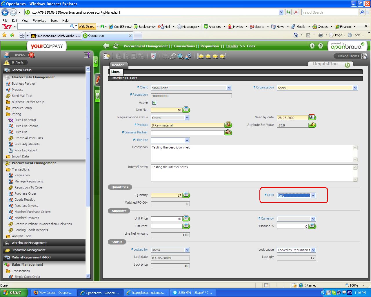 | Steps To Reproduce | Steps to reproduce the above issue: move to Master Data Management || Product Setup || Unit of Measure || Unit of Measure and click new. EDI code : Bg Symbol: Bg Name: Bag Move to Master Data Management || Product || Product and edit a product and change the UOM as Bag for which the UOM is Unit Move to Procurement Management || Transactions || Requisition || Header, to create a new requisition, click new. BP: Select any valid BP Move to lines: Product:Select the Product for which we have changed the UOM Need by Date: any future date Quantity: 17 Actual result: Verify the UOM field, it shows wrongly as Unit by default. Expected result: UOM should be Bag Note: user not able to change the value, since the UOM field is read only Then i moved to Requisition to order (Procurement Management || Transactions || Requisition To Order || Requisition To Order ) process, where i selected the above created requisition and clicked Add to moved the requisition to the below window. Then again i have selected the same requisition and clicked create button. System throws error message as 'Unit of Measure mismatch (product/transaction)' instead of creating a PO. | |||||||