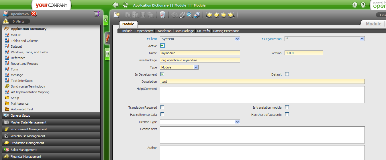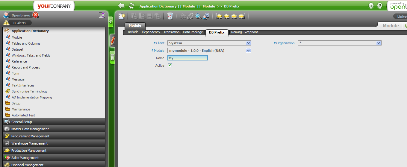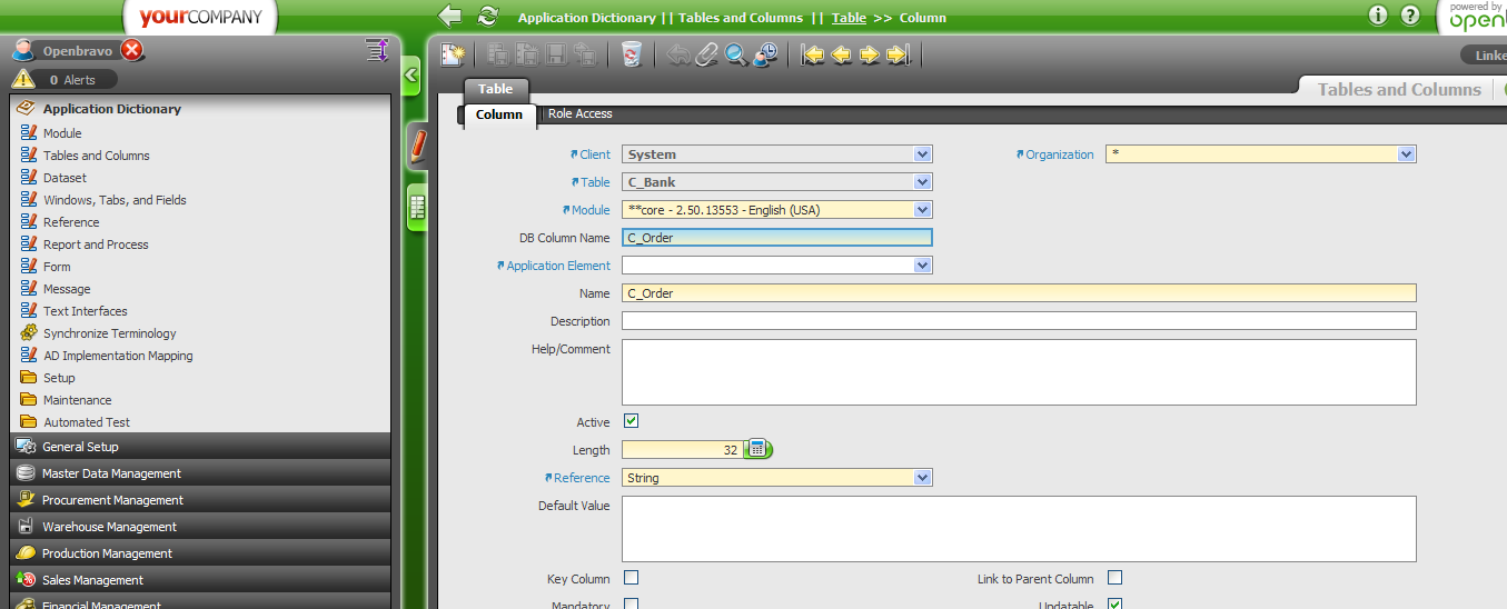 | Steps To Reproduce | 1. Go to application dictionary->Modules 1.1. Create column with name: C_ORDER in C_BANK table in the DB 1.2. Create a module with name: My module. See attach_1.png 1.3. Create a db prefix for the module. my. See attach_2.png 1.4. Create an exception for the module related to the column. See attach_3.png 2. Go to Application dictionary->Tables and columns. Select C_BANK table 2.1 Click the button Create columns from DB 2.2 Move to columns tab and select the new created column C_ORDER. See attach_4.png 2.3 Select the module Mymodule from the module combo box. The error comes. See attach_5.png | |||||||