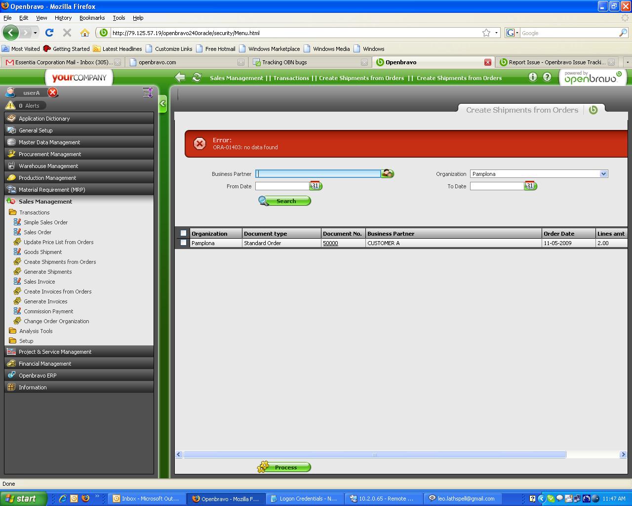 | Steps To Reproduce | Login as userA Goto Sales management -> Sales order. Complete a sales oredr. Now create shipment for this sales order using "Create Shipment from orders" or "Generate Shipments". It shows error as "No data found". | |||||||
