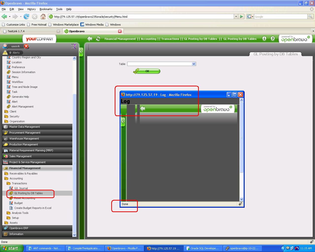 | Steps To Reproduce | * Login as userA * Go to Financial management->Accounting->Transactions->GL Posting by DB Tables * No tables selected * Click OK Popup window opened. It shows Log. Then it displays "Done" at the bottom of the page. But it does not display any log there. | |||||||