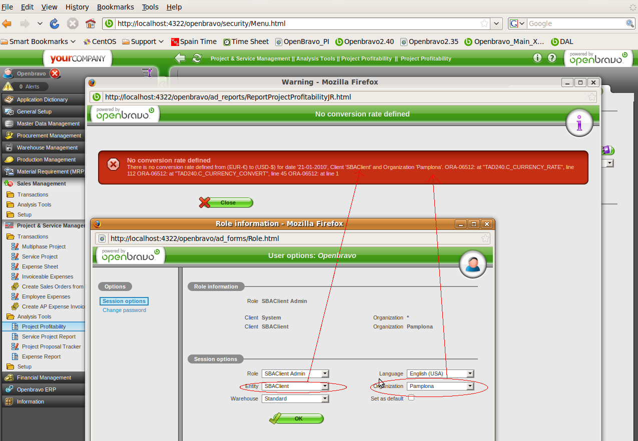 | Description | I entered some projects and then I launched the report of profitability. All projects currencies were EUR, and the report was requested in USD. I had no conversion rates EUR>USD nor USD>EUR defined for my Client, neither the other clients I had. When launching the report, I had an error message about not defined conversion rates. But note that the error says that BigBazaar client and Main organization have not defined rates (see attach). It is weird, since I do not have any client "BigBazaar". So I went to one similar client I had "SmallBazaar", added the conversion rates, and after that, the report can be displayed. | |||||||