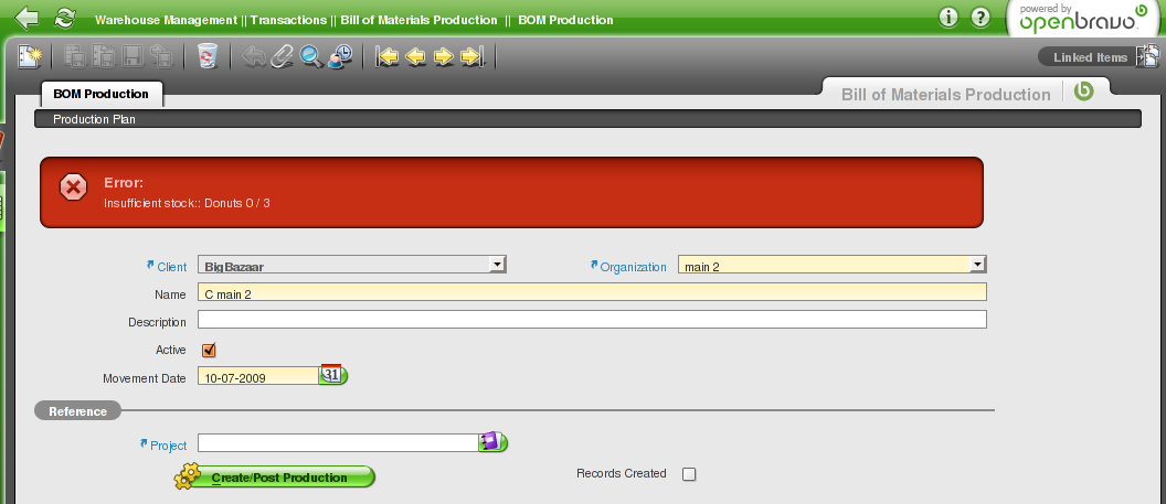 For testing this fix: 1) Create a new Organization in the same level that Main and Set it Ready as Legal Entity. 2) Create a Warehouse and a Storage Bin for this new Organization. 3) Change Main Warehouse and its Storage Bins organization to Main (it is now in *). 3) Create a BOM Production for the new Organization in Warehouse Management || Transactions || Bill of Materials Production || BOM Production 4) Create a Production Plan for the new Organization selecting one of its Storage Bins and select product Foodkit (made of Donuts and Grand Beers which are stocked in Main Warehouse storage bins belonging to Main organization as we changed it). 5) Click on Create/Post Production: you will get "Error:Insufficient stock:: Donuts" because there are no Donuts stocked in the new organization warehouses (see attached image). |
