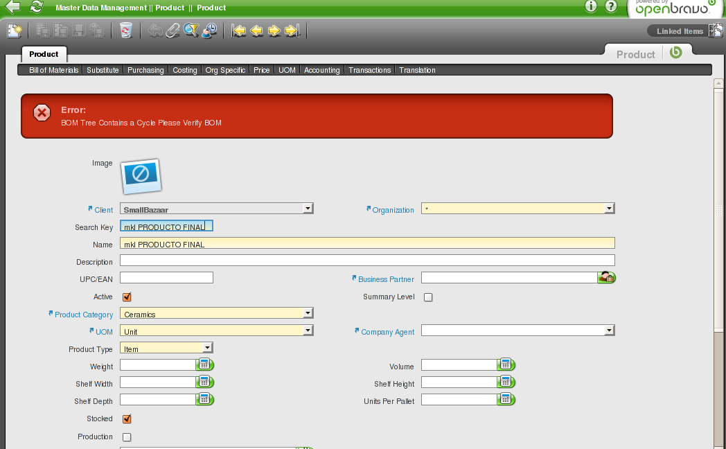 | Proposed Solution | Openbravo ERP 2.40 version has to work exactly as Openbravo ERP 2.50 does: The process Verify BOM (M_product_bom_check process) DOES check that there is no infinite loop on-going: 1) Create a new product and click on Bill Of Materials. 2) Create a second product and click on Bill Of Materials. 3) Go to Bill of Materials tab and select the fist product. 4) Go to the first product and, Bill of Materials tab, select the second product. 5) In this first product, click on Verify BOM. You get error (warning) message: BOM Tree Contains a Cycle Please Verify BOM (see attached image) | |||||||