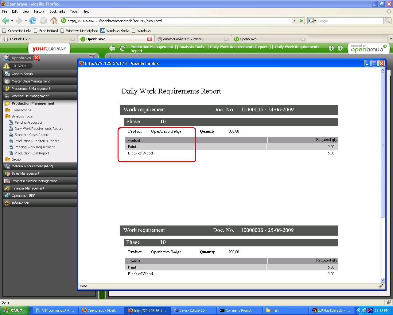 | Steps To Reproduce | Go to Production management->Analysis Tools-> Daily Work Requirements Report Enter the date fields for "Start From date" and "To date". Click HTML format and view the report. The report has Work requirement document number, phase, products and their quantities. It will be useful if we specify the type of products like which one is production product and which products are required to produce the production product. | |||||||||||