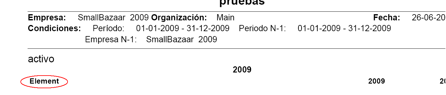 The "Element" String was already translated. I have checked it into the XML files and also in the database: select tr.* from ad_textinterfaces_trl tr join ad_textinterfaces t on (tr.ad_textinterfaces_id=t.ad_textinterfaces_id) where filename='/org/openbravo/erpCommon/ad_reports/GeneralAccountingReportsPDF.fo' and t.text like '%Element%'; 0009353 should be reopened |