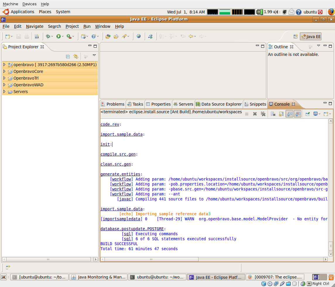 * I run eclipse in Ubuntu 9.04 (virtual machine) with a modified version of eclipse.ini (see the attached file) increasing the max memory * Attached you'll find the result of the install.source. The last part of the log file: ubuntu.eclipse.install.source.log, and an image: ubuntu.install.source.png * I took more time to compile but is working Constraints: * Is a brand new installation of eclipse without any plugin but the MercurialEclipse * Is a brand new workspace with the 'Build automatically' disabled * I used MercurialEclipse to clone from a local repo * The code is updated to the 2.50MP1 tag * I used the setup binary to set the Openbravo.properties and all other configuration files Please make sure that all your environment is configured: http://wiki.openbravo.com/wiki/Development_Stack_Setup [^] |